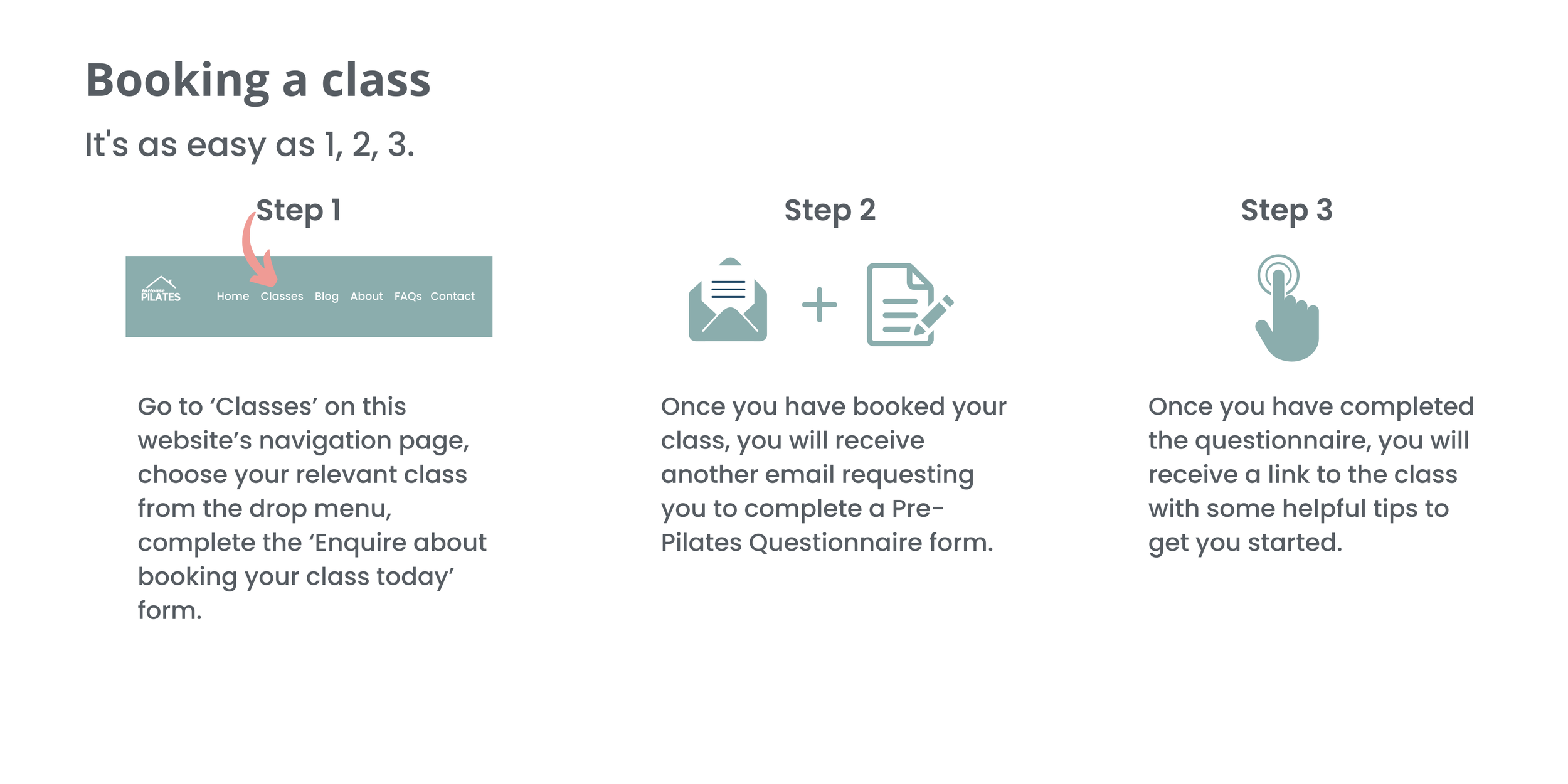 Once submitted, you will be requested to fill out a ‘Pre-Pilates Questionnaire’. This form helps me understand if you have any injuries, surgeries, or medical conditions that may affect your Pilates practice.